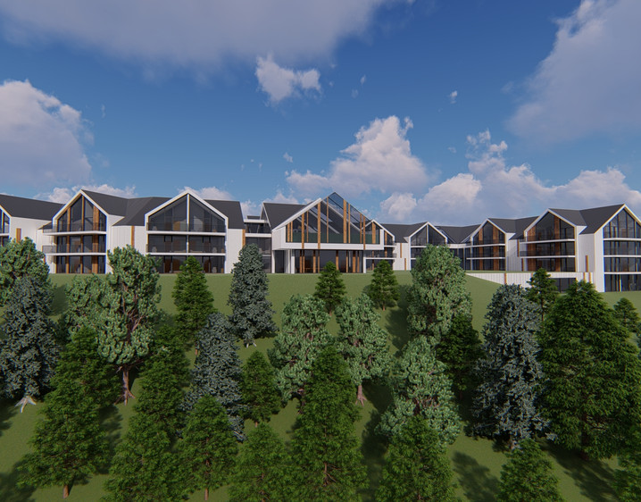 The other part of the investment is a hotel building, also in the most part 3-storeys high (3 above-ground storeys). The entrance area is located in the central part of the hotel. Nearby there is also designed a restaurant, kitchen, office, luggage storage and conference rooms. Above them there is located a swimming pool, SPA and saunas. Above the changing rooms and communication there is mezzanine open to the SPA, which is a part of it, glazed from the north and from the south (with a view of the pool and lake). Both remaining parts of the hotel have 3 floors developed with hotel rooms, communication and rooms for hotel service. In the underground part of the hotel there is a garage with 163 parking lots, a technical rooms and a service part for the hotel users (multimedia room, bar, billiards, gym, children’s playroom).