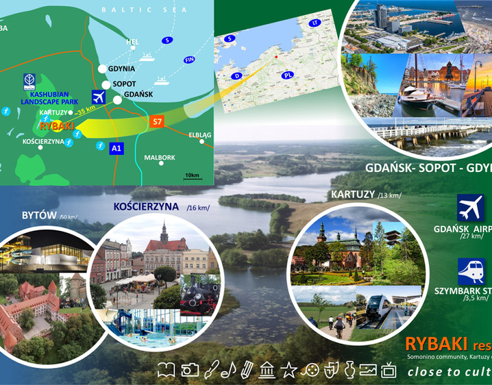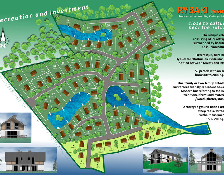 Features of the project: 70% of the territory is bordered by the National Nature Park (332 sq.km) and conifer forest Unique natural landscape, which will open a beautiful view of the forest and lakes from any house (3 artificial lakes on the project territory) 2 km (Jezioro Ostrzyckie) – 6.4 km long and 0.8 km wide Gdansk International Airport – 27 km